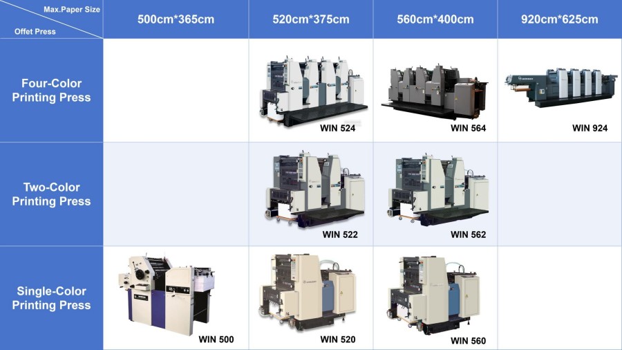 विन ऑफसेट प्रेस (एकल-रंग, दो-रंग, चार-रंग, छह-रंग + यूवी) के विभिन्न प्रकार के मुद्रण प्रारूप (जैसे, क्वाड, डबल, बड़े डबल प्रारूप) और रंग विन्यास उपलब्ध हैं, जो छोटे-प्रारूप वाले बिजनेस कार्ड और फ़्लायर्स से लेकर बड़े-प्रारूप वाले पोस्टर और पैकेजिंग बॉक्स तक विभिन्न मुद्रण आवश्यकताओं के अनुकूल हैं। विन सिंगल-कलर प्रिंटिंग प्रेस, टू-कलर प्रिंटिंग प्रेस, फोर-कलर प्रिंटिंग प्रेस बड़े आकार और मोटे कागज की प्रिंटिंग आवश्यकताओं के लिए समर्पित हेवी-ड्यूटी मॉड्यूल प्रदान करते हैं - एक ऐसा लाभ जो सामान्य डिजिटल प्रिंटिंग उपकरण से मेल नहीं खा सकता है। विन सिंगल-कलर प्रिंटिंग प्रेस सीएमवाईके चार-रंग की अलग-अलग प्लेटों को लगातार चार पासों में प्रिंट करके उच्च गुणवत्ता वाले रंग मुद्रण प्रभाव प्राप्त कर सकता है, जो उच्च लागत प्रदर्शन अनुपात की पेशकश करता है और छोटे और मध्यम आकार के प्रिंटिंग हाउसों की रंग मुद्रण आवश्यकताओं को पूरा करता है।